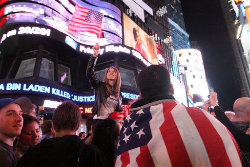 Draped in the American flag, Pedro Valerio, of Elizabeth, N.J., right, and others in New York’s Times Square react to the news of Osama Bin Laden’s death early Monday morning May 2, 2011. (AP Photo/Tina Fineberg)
