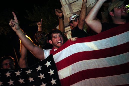 University of Georgia students wave flags as they celebrate the death of Osama bin Laden in front of a Civil War Memorial on the morning of Monday May 2, 2011 in Athens, Ga. (AP Photo/Athens Banner-Herald, David Manning) MANDATORY CREDIT